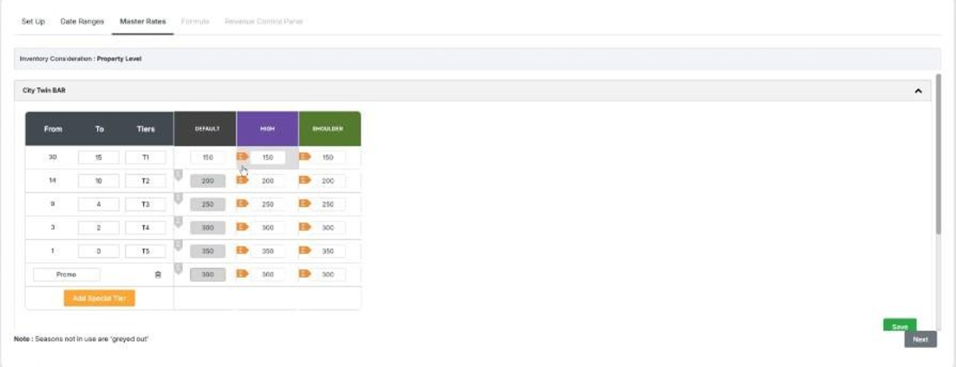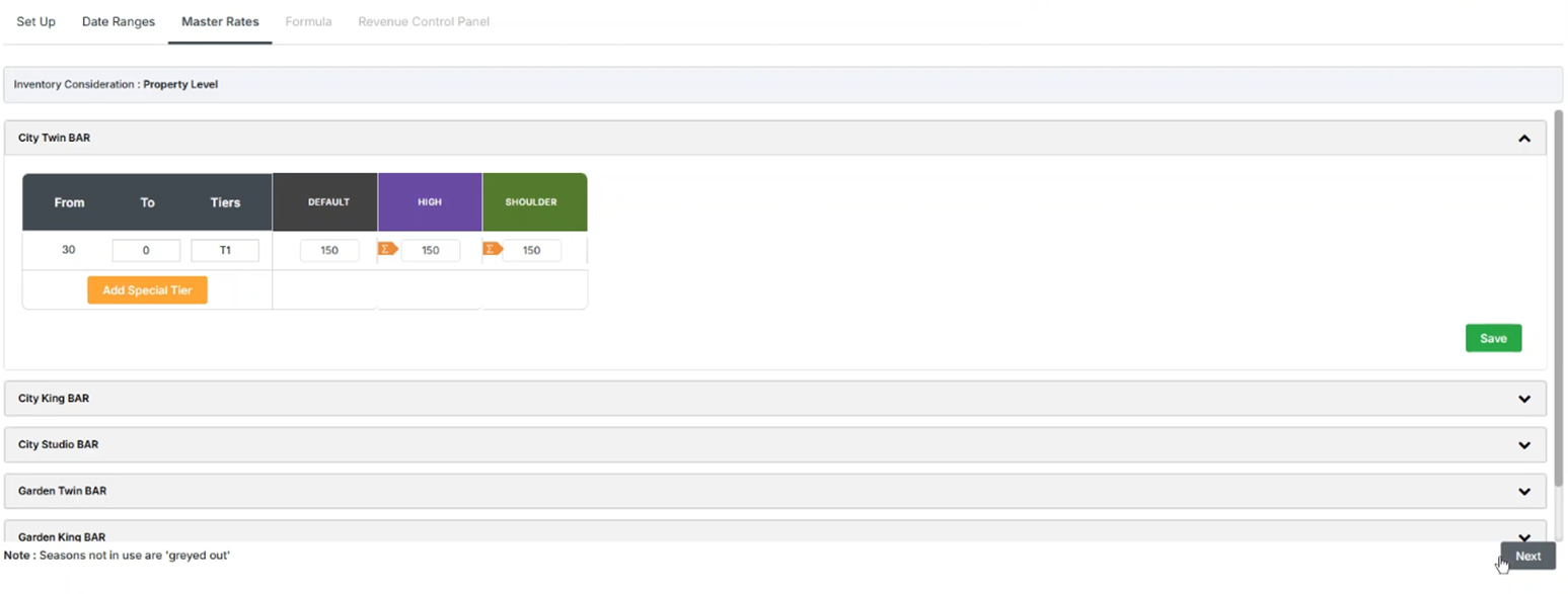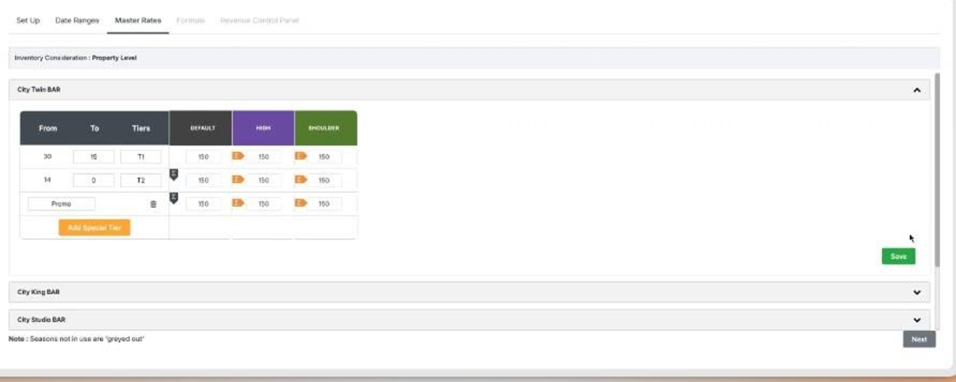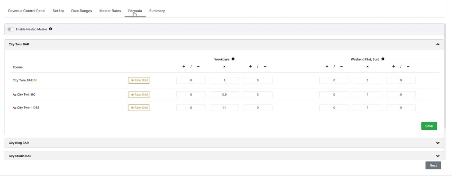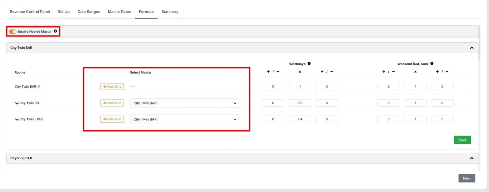 City Twin BAR adalah Master 'Utama'. Standard Bed & Breakfast memiliki opsi untuk memilih salah satu dari tiga tarif lainnya dan menetapkannya sebagai tarif utama. Jika 'City Twin Bar' ditetapkan sebagai master, tarif untuk 'City Twin RO' dapat diperoleh dari tarif City Twin DBB yang dihitung