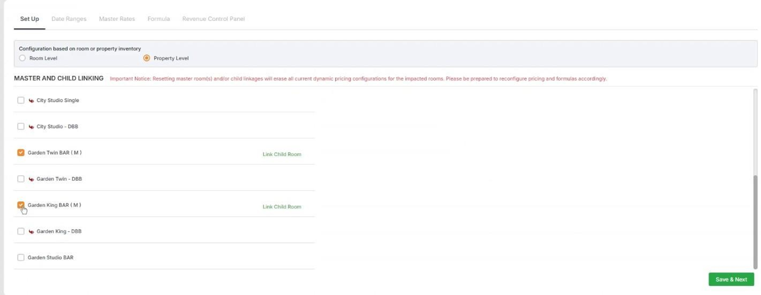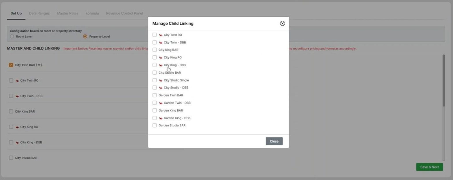 Dalam kasus pertama ini, yaitu pengaturan master tunggal, kami memilih tarif master utama dan kemudian menautkan tarif anak ke tarif tersebut dengan mengklik "Tautkan Anak". Tidak ada keharusan bahwa tipe kamar utama harus menjadi master, tipe kamar yang ditautkan juga bisa menjadi master. Kemudian kita centang semua anak rencana tarif.