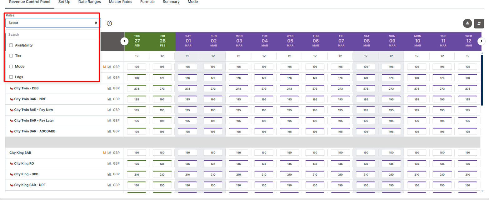 5.Kontrol Pendapatan: Gambaran lengkap tentang tarif yang berlaku untuk setiap Tipe Kamar. Tarif yang ditampilkan dihitung menggunakan pengaturan yang diterapkan di Musim, Harga Dinamis, dan Formula.