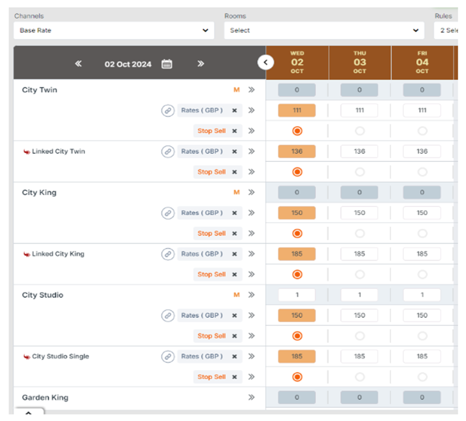 Pada tab Rates di bagian Availability & Rates, fitur STOP SELL akan otomatis diterapkan pada harga dasar (Base rates) untuk semua tipe kamar.