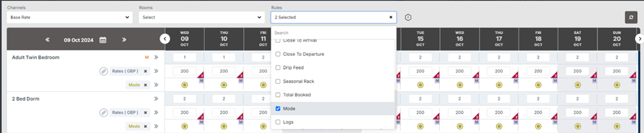 Mode Dinamis – Harga dihitung menggunakan pengaturan yang diterapkan dalam Seasons, Dynamic Pricing, & Formula ketika Sistem Manajemen Revenue diaktifkan.