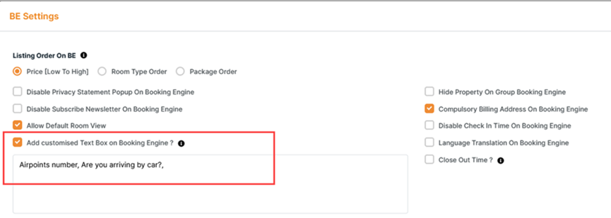 Booking Engine > BE Setting > Aktifkan opsi 'Add customised text box on booking engine' > Buat label untuk kotak teks