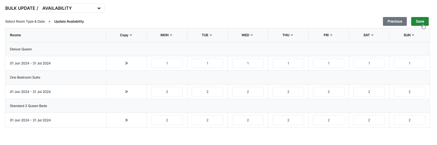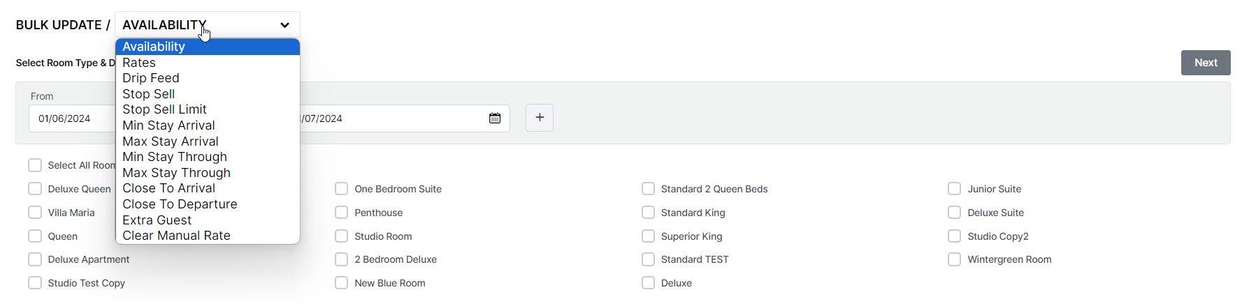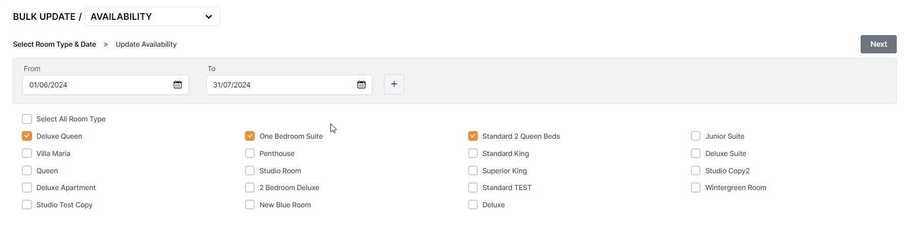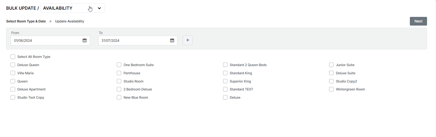 Chọn loại phòng và phạm vi ngày để cập nhật. Nhấp vào Tiếp theo