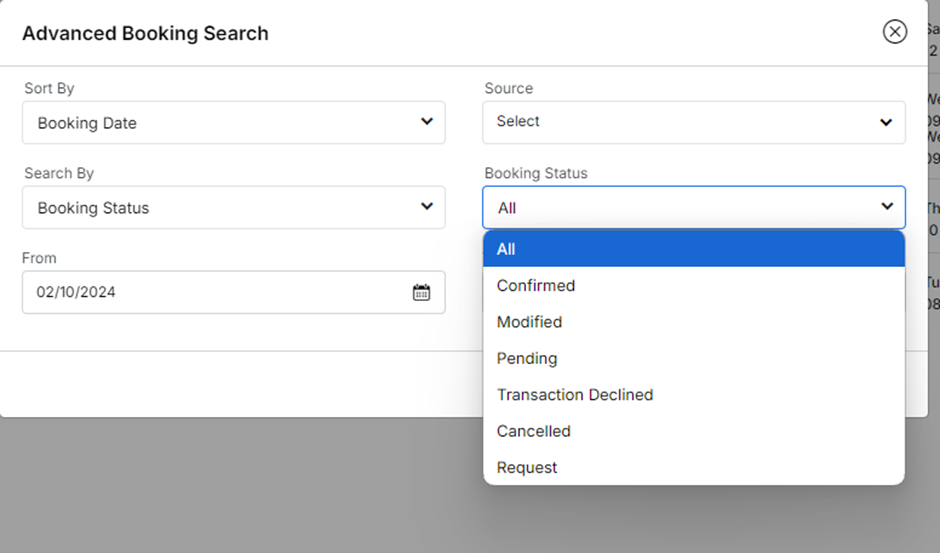1. Pada parameter pencarian, ubah "Search By" menjadi Booking Status.