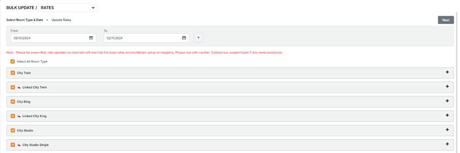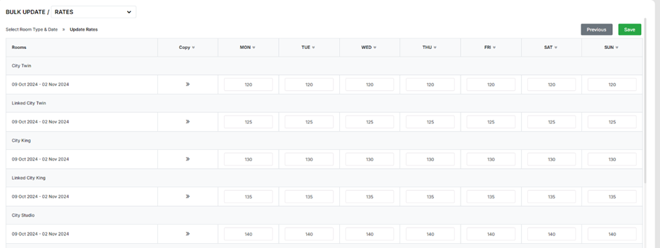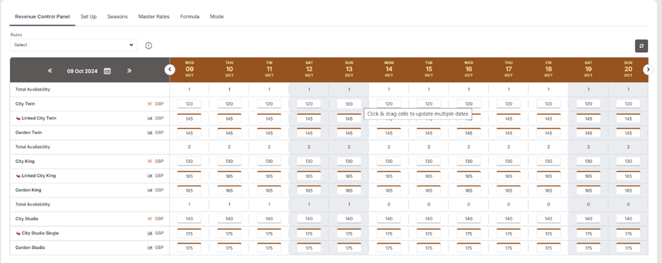 4. Tarif yang diperbarui untuk Master room dan child room akan ditampilkan di Revenue Control Panel seperti yang telah diperbarui melalui Bulk Update.