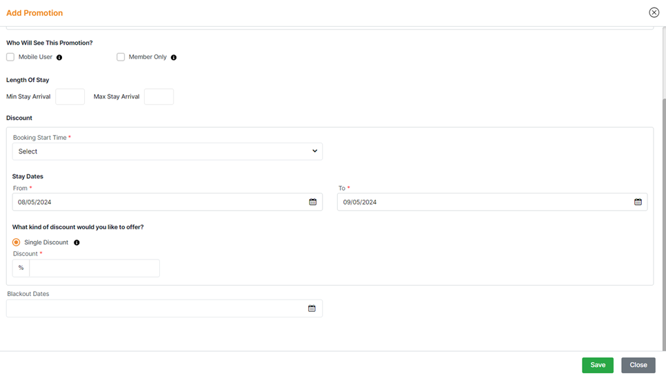 Pilih rentang tanggal di mana tamu harus melakukan pemesanan untuk mendapatkan diskon promosi.