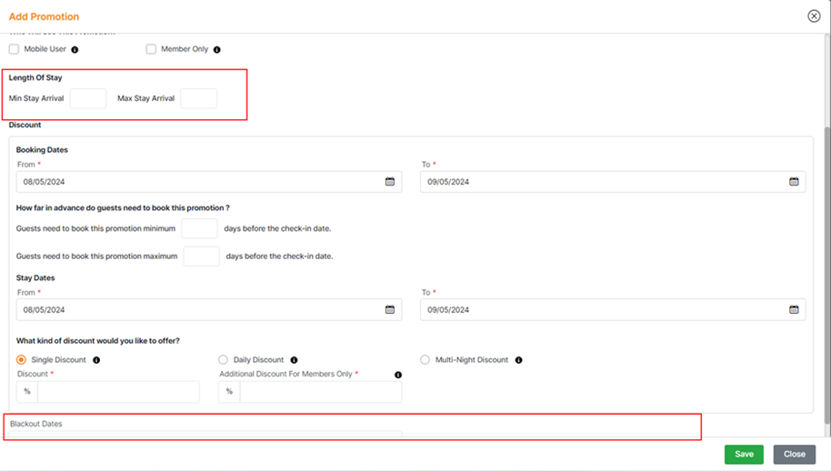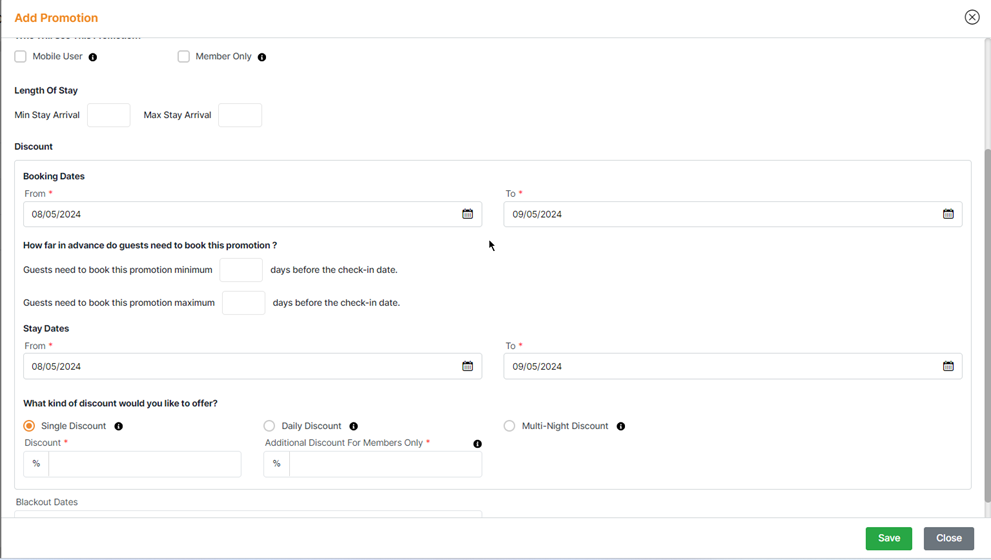 Rentang tanggal di mana tamu harus menginap agar diskon promosi berlaku.