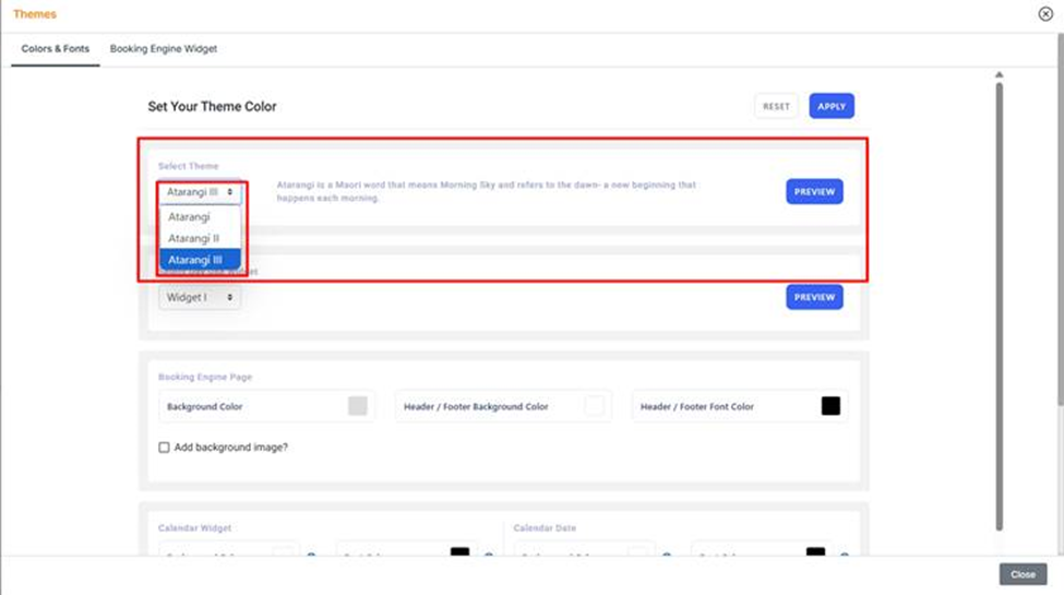 Kami baru-baru ini meningkatkan desain Booking engine dan memperkenalkan tampilan baru yang membuat informasi kamar dan fasilitas awalnya tersembunyi untuk tampilan yang lebih bersih. Tema ini sekarang memiliki nama dan disebut 'Atarangi'. Atarangi adalah kata dalam bahasa Maori yang berarti Langit Pagi dan merujuk pada "fajar" atau awal baru yang terjadi setiap pagi.