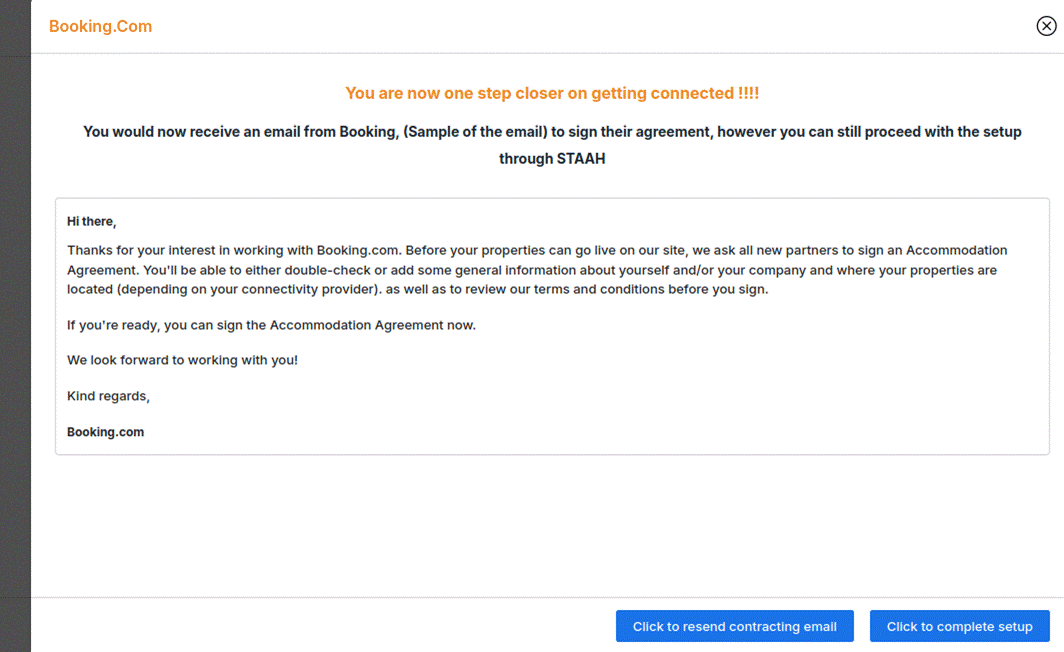 Setiap kali properti mengunjungi halaman pemetaan saluran, sistem kami memeriksa apakah kontrak telah ditandatangani dengan Booking.com. Jika tidak, kami menampilkan halaman penandatanganan kontrak tertunda seperti yang ditunjukkan pada tangkapan layar di bawah ini.