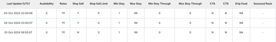 Di dalam logs, Anda dapat melihat ketersediaan terkini di STAAH MAX, lengkap dengan informasi pembatasan Minimum Stay dan Stop Sell yang dikirim secara otomatis.