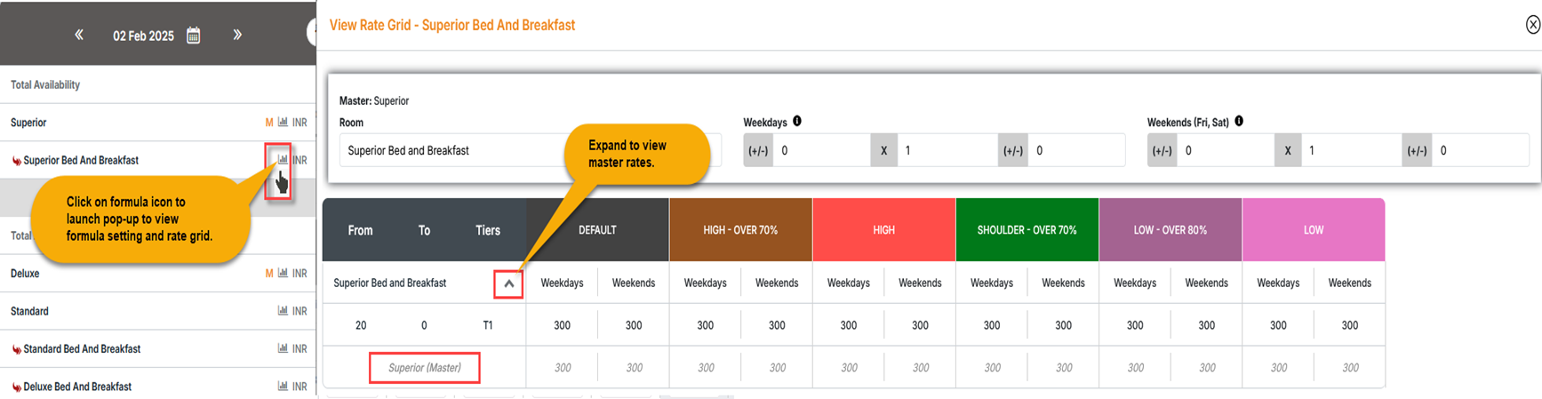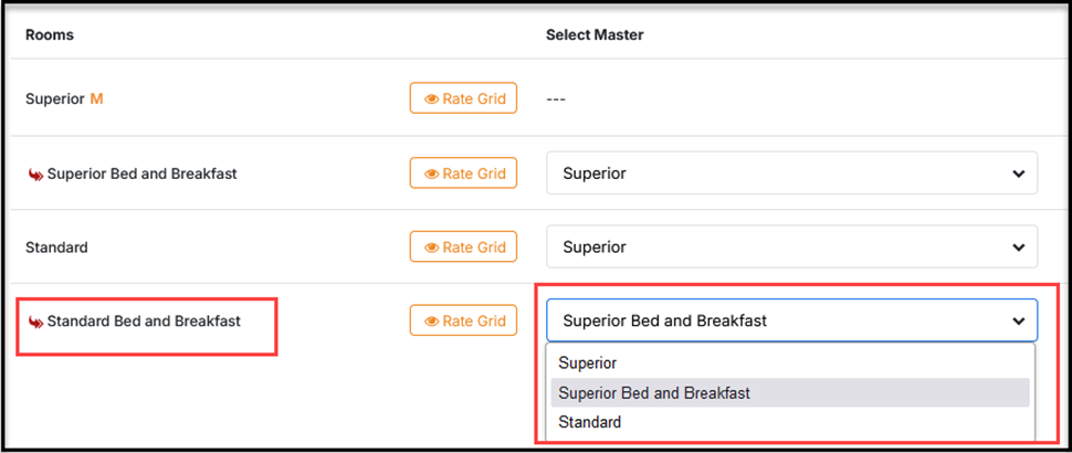 •If ‘Superior Bed and Breakfast’ is set as the master, the rate for the ‘Standard Bed and Breakfast’ will derive from the Superior BB rate which is calculated from the Superior Rate