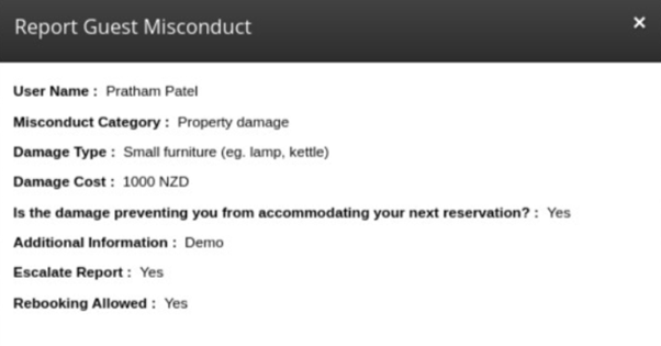 The report guest misconduct tool supports specific scenarios specified by Bookng.com, so the misconduct needs to match one of the scenarios. Reports can be submitted anytime one day after check-in to seven days after check-out.