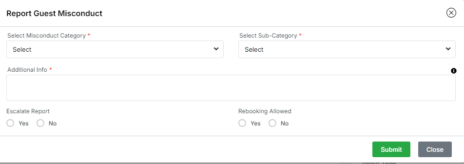 • Select misconduct category: drop down option, all fields are provided by Booking.Com