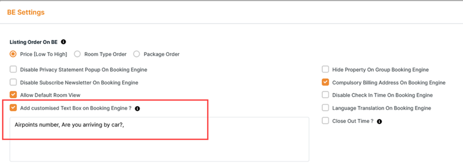 Booking Engine > BE Settings > Enable flag 'Add customised text box on booking engine' > Create text box label