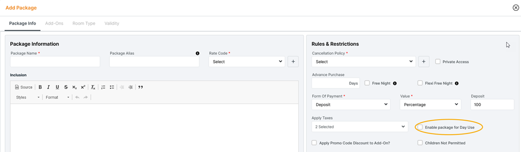 2.To activate the day use offering, select the ‘Package for day use’ flag by checking the box