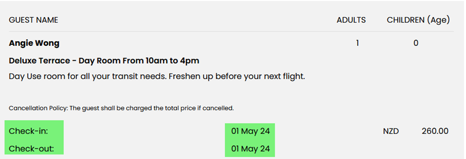 2.On the confirmation page and in the booking email confirmation, the check in and check out date will be the same.