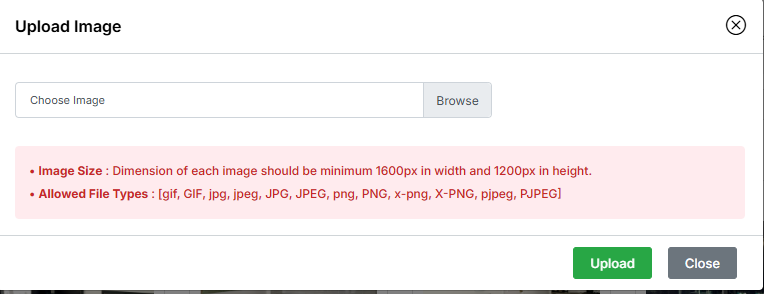 2. Upload the image by clicking on Browse, select the photo from your computer and Save. Unlimited images can be uploaded at a time. Make sure they are of the correct dimensions and type.