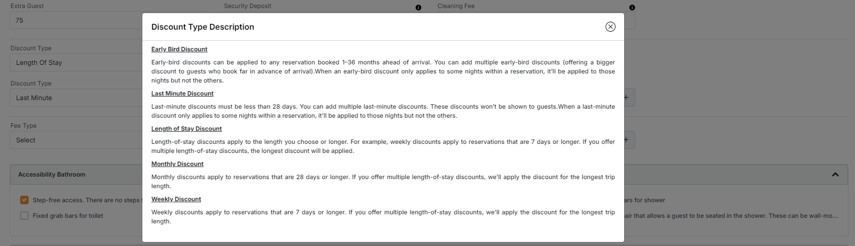 Airbnb offers the following types of basic discounts: Early Bird, Last Minute, Length Of Stay, Non-Refundable, Weekly and Monthly.