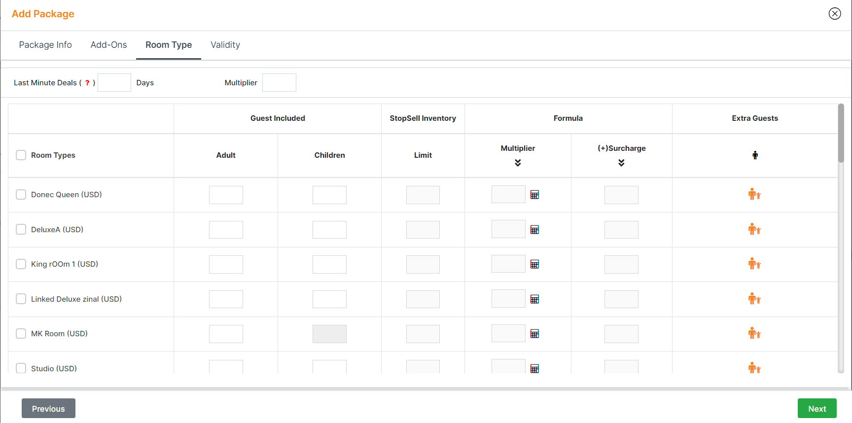 Tick the rooms to be attached to this package. Apply the multiplier as appropriate and hit next.