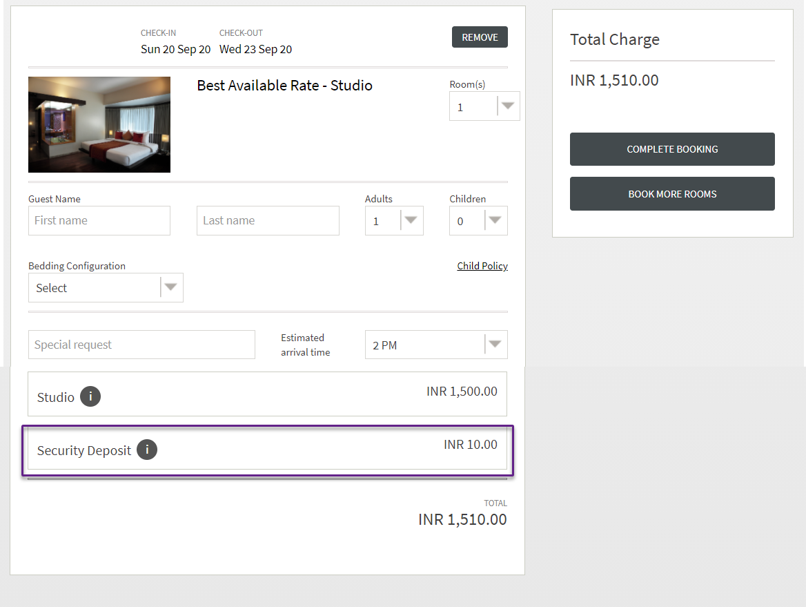 Security deposit amount indicated once the booker has selected room/package.