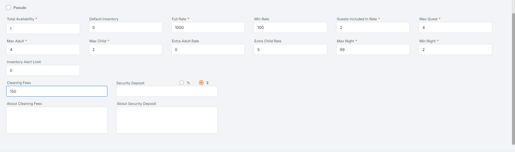 A feature for VR properties, allowing you to apply security deposit charges. Security deposit is easy to use and gives you the flexibility to choose the room type(s) to apply to.