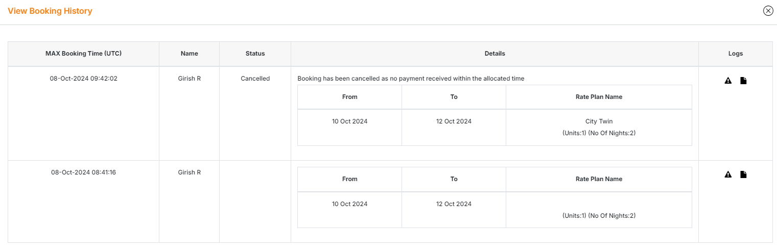 This option allows you to view history of modified booking