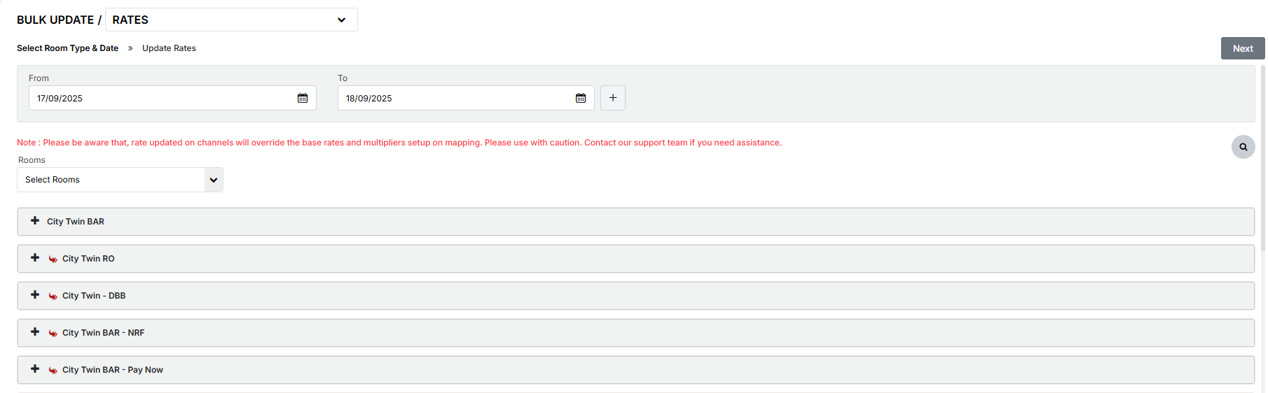 - Select the room types and the date range that has to be updated. Click on Next