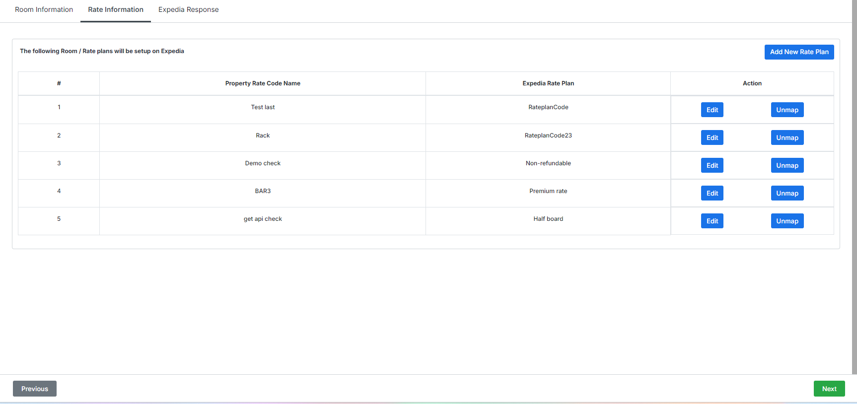 Rate information: From this tab you can edit mapped rate plans, map to an existing rate plan on Expedia or create a new rate plan.