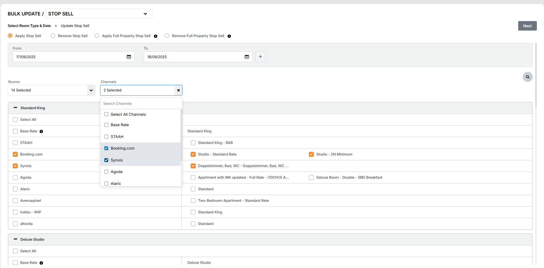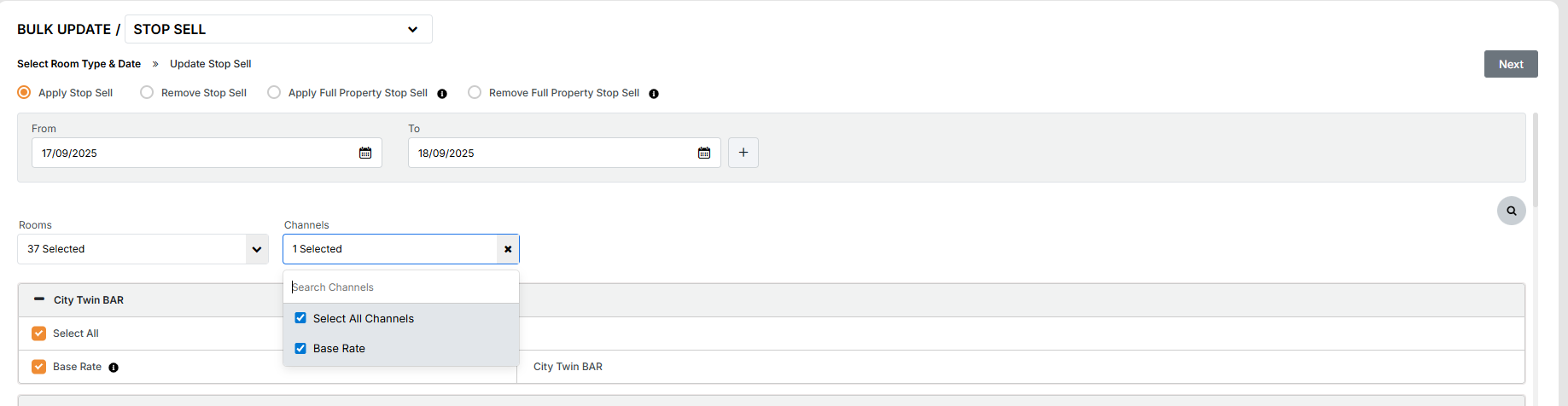 3. Select Channels/rate plans for which restriction needs to be updated