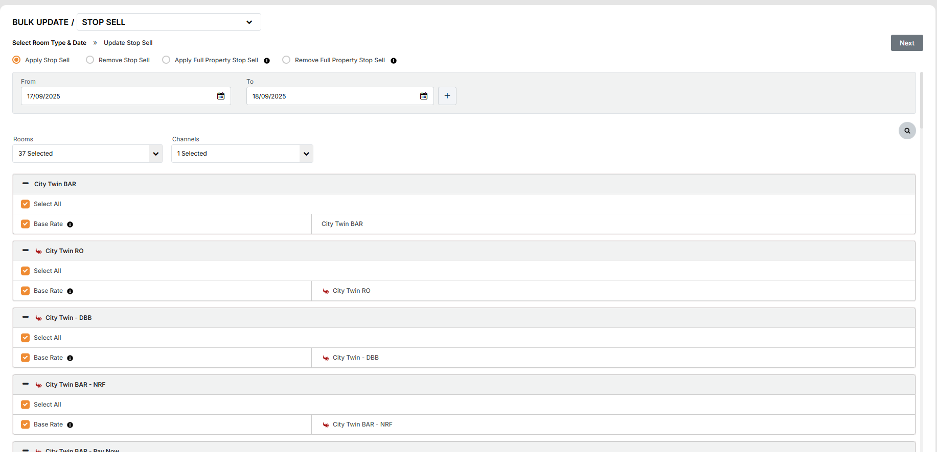 1. Click on the room name on which restrictions needs to be updated and Click Next